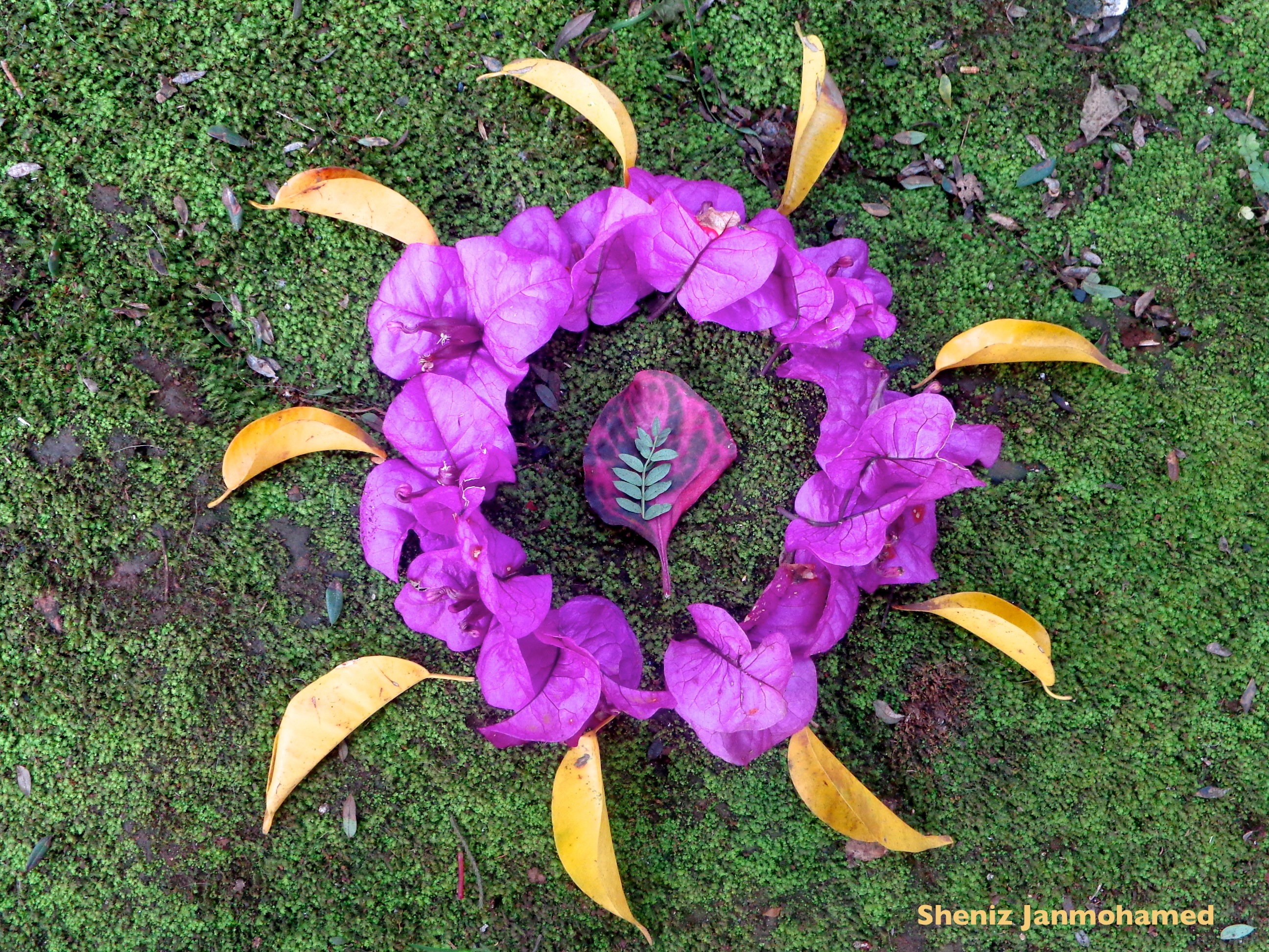 The beauty of my grandmother’s garden, or any garden, for that matter, is that what a tree discards is just as beautiful as what it grows. Walking is an art of discovering and uncovering. I love making ‘mandalas’ in nature because it’s not about creating perfection- it’s about participating in nature, allowing it to speak to you, and then letting it go. The next day, I visited my mandala to see if it was still intact. The dogs had trampled it, flowers were missing, but it was just as ‘complete’ as it was the day before.