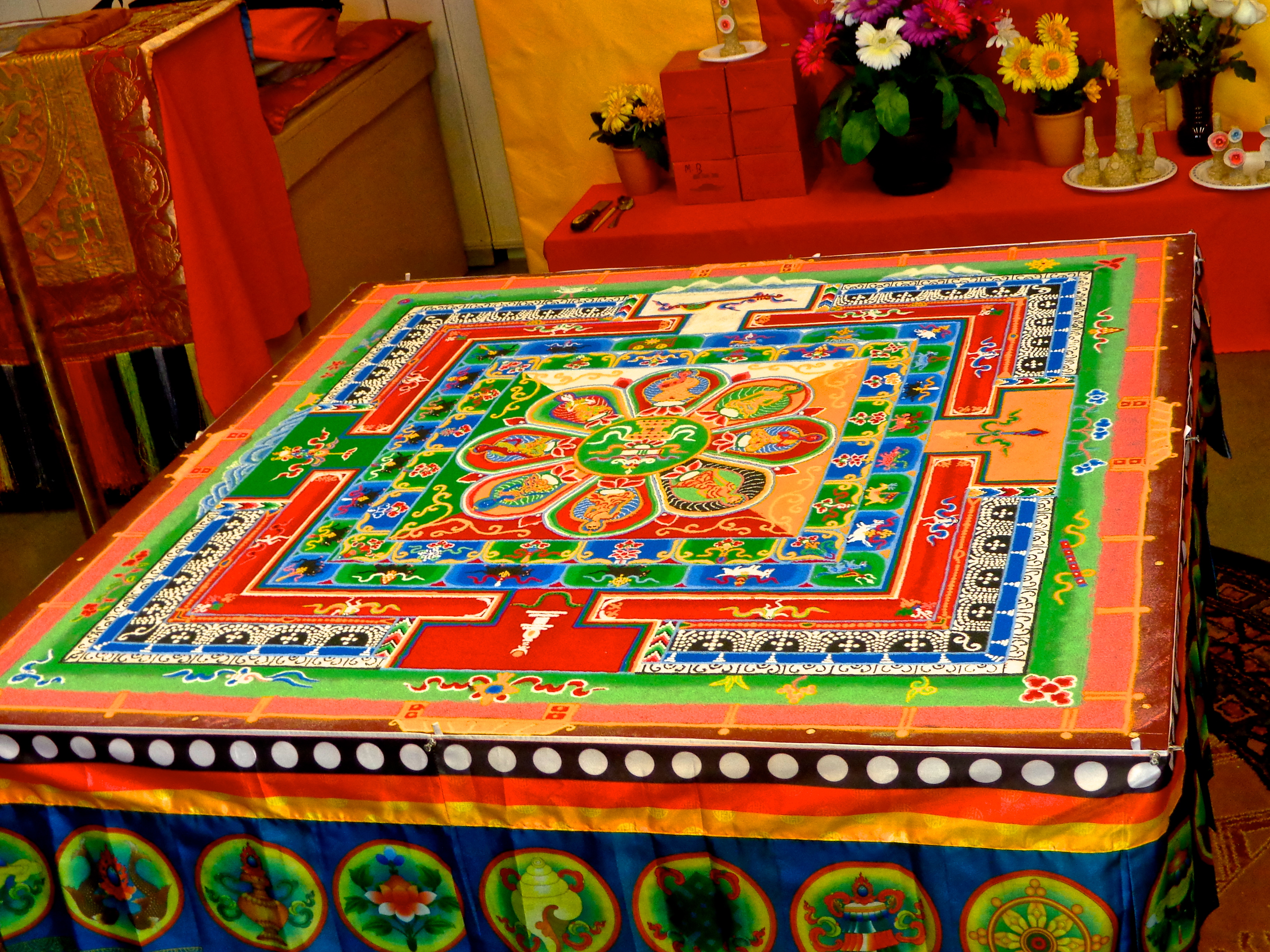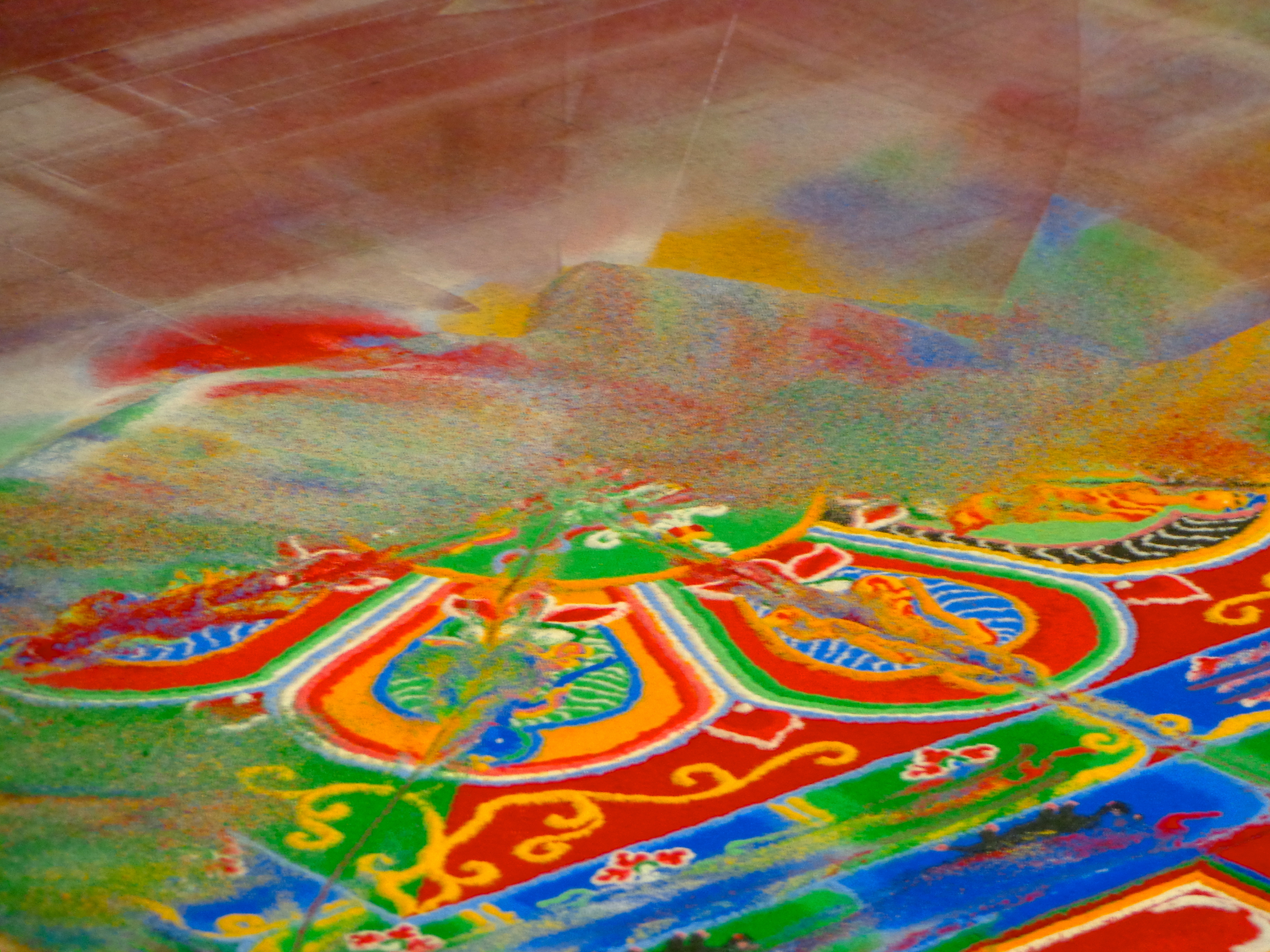 I was up North because I went to witness the creation and destruction of the Medicine Buddha Mandala, which was being carried out by an elderly lama from Bhutan. He had come with Lama Karma Namgyel, who runs Drukpa Mila Buddhist Center in Longmont, Colorado and was leading a Medicine Buddha Retreat and numerous teachings/ceremonies throughout the week. The sand mandala is created and destroyed to symbolize impermanence (a very simplified reason, the mandala is a complex palace of visualizations and symbols- it would take much time and research to explain it completely and fully), but also so that the coloured sand could be released into a nearby spring/body of water to protect and purify the land/water and all the people who live near it/by it. It is a means of circulating healing.