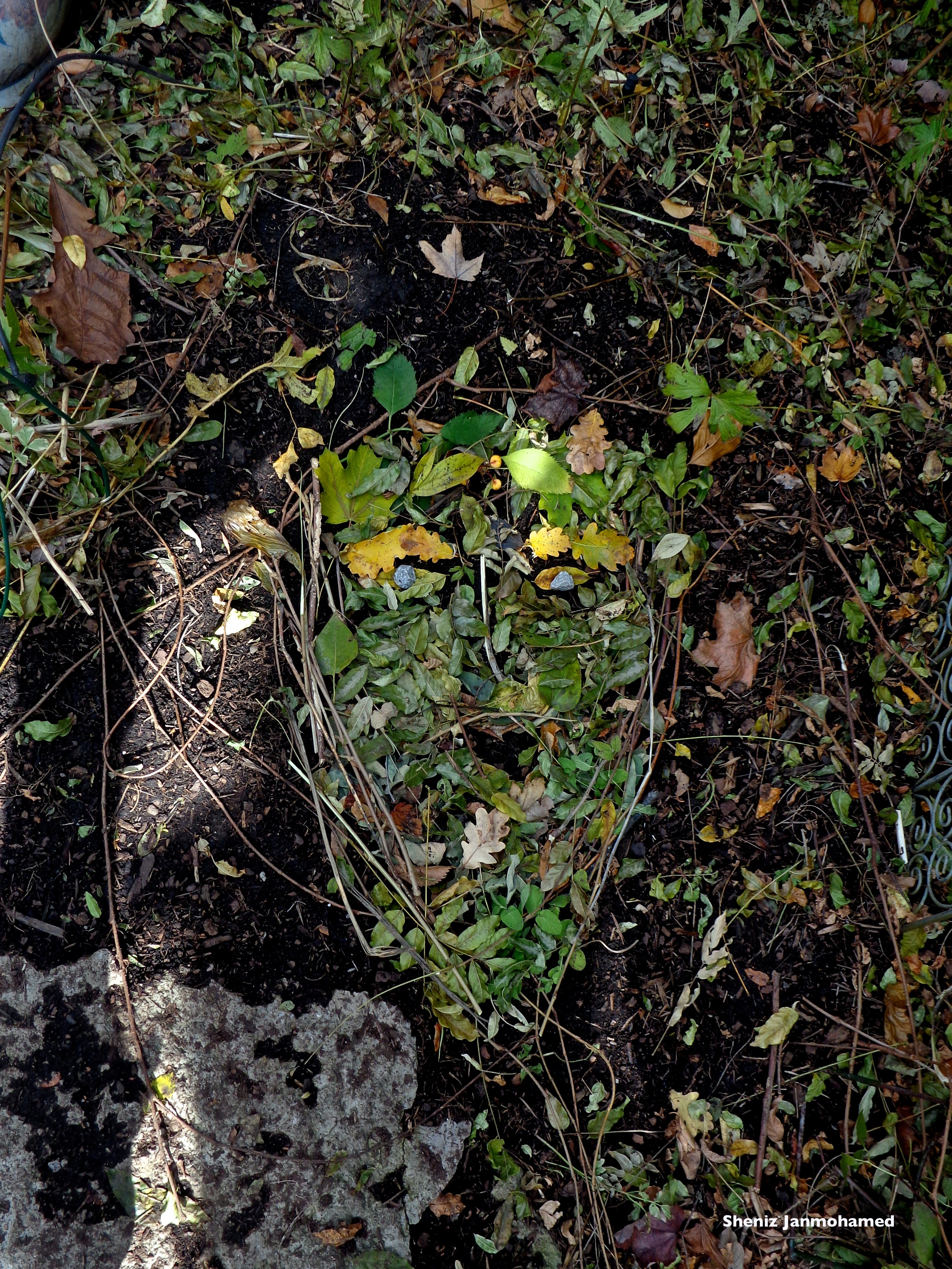 I walked home yesterday & picked up leaves, twigs and branches along the way. The Green Man had to be brought to life in the garden. I was determined, even though it was getting dark and colder by the minute. I collected damp leaves, picked jagged stones for his eyes, found rippled leaves for his eyebrows. Most of my search was done at twilight- not quite day, not quite night. I could hardly see what I was doing.  But I trusted my hands to pick up what was needed and discard what was not useful.