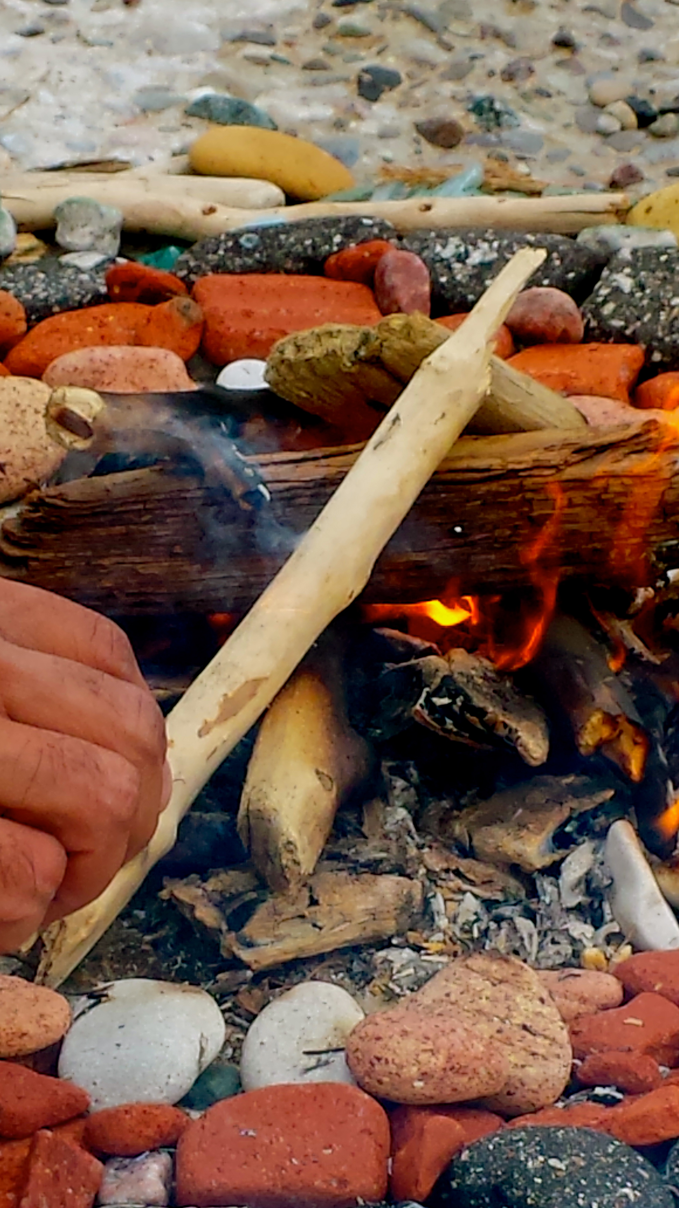 We managed to light a fire with a lighter that was almost dead, using collected driftwood and bark for the firewood. Flames leapt from the centre of the mandala. We offered palo santo and cedar. The wind carried wisps of smoke over the water.