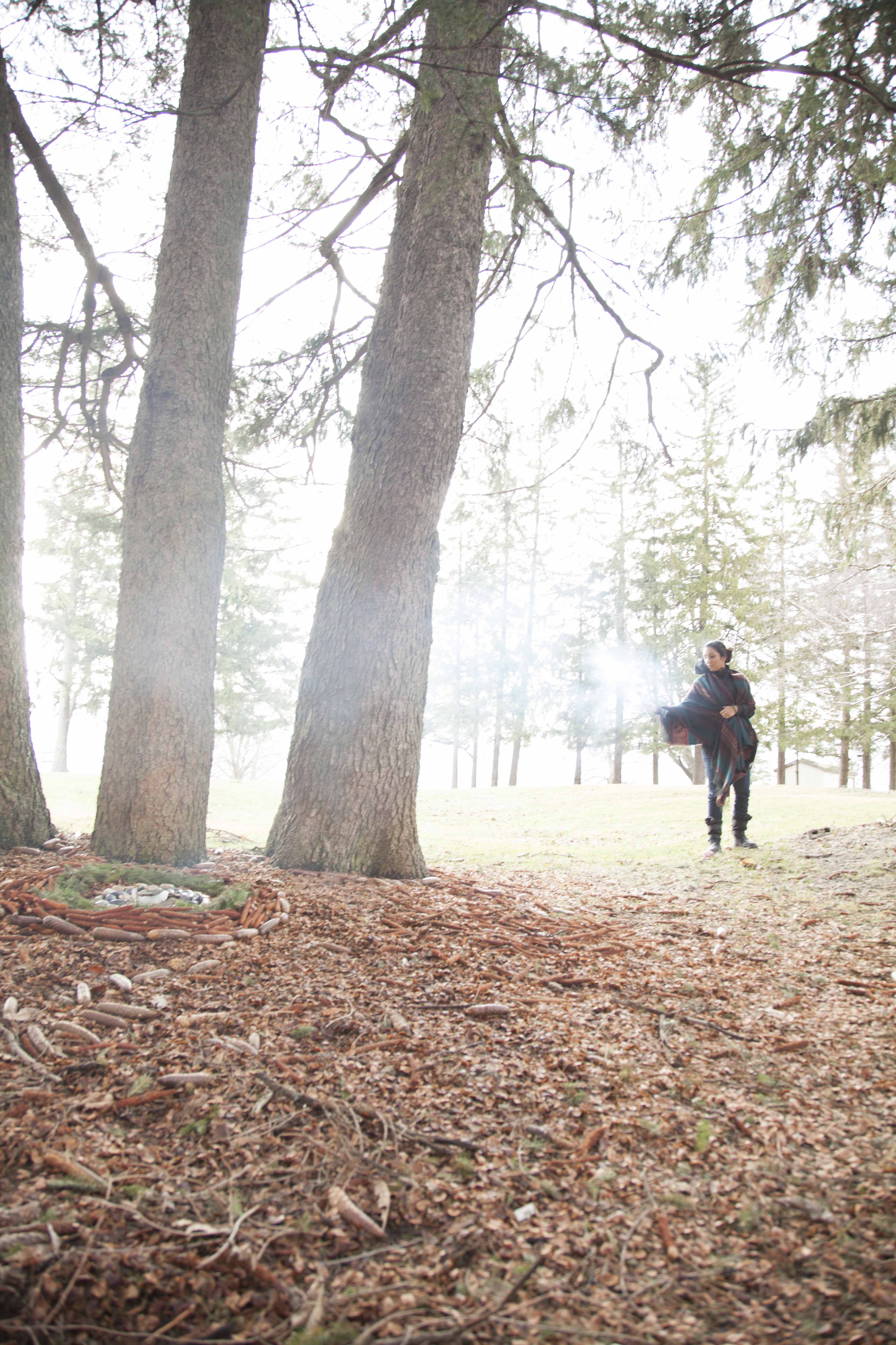 When we set out to find a suitable location to shoot the cover, it rained. It rained and rained and rained. We drove around the entire day, site to site, to wait for the rain to pass so we could get an hour of good light to shoot in. No such luck. By the end of the day, I was losing hope and patience. But I didn’t want to give up. It needed to be done. And so, at the last possible moment, we went to a forest. The rain stopped. I worked furiously at gathering pinecones and creating a circle, filling it with rocks and pine needles. We lit sage and offered lavender. We watched the sunlight dip between the trees and illuminate the mandala I had created. Nothing else was needed in that moment. It was perfect.